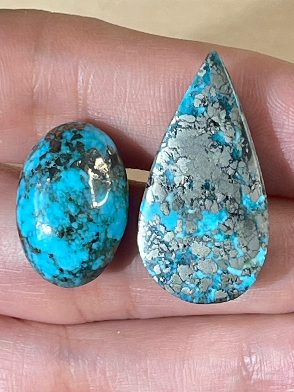 Discover these 2 beautiful turquoise stones sourced from the Kerman mine in Southern Iran. The larger stone is tear-shape stone with rich blue colour and a lot of reflective golden pyrite content. A very special stone for those who like pyrite inclusion in turquoise. The smaller one is an average size cabochon turquoise also with pyrite inclusion which is great for making both a ring or pendant.