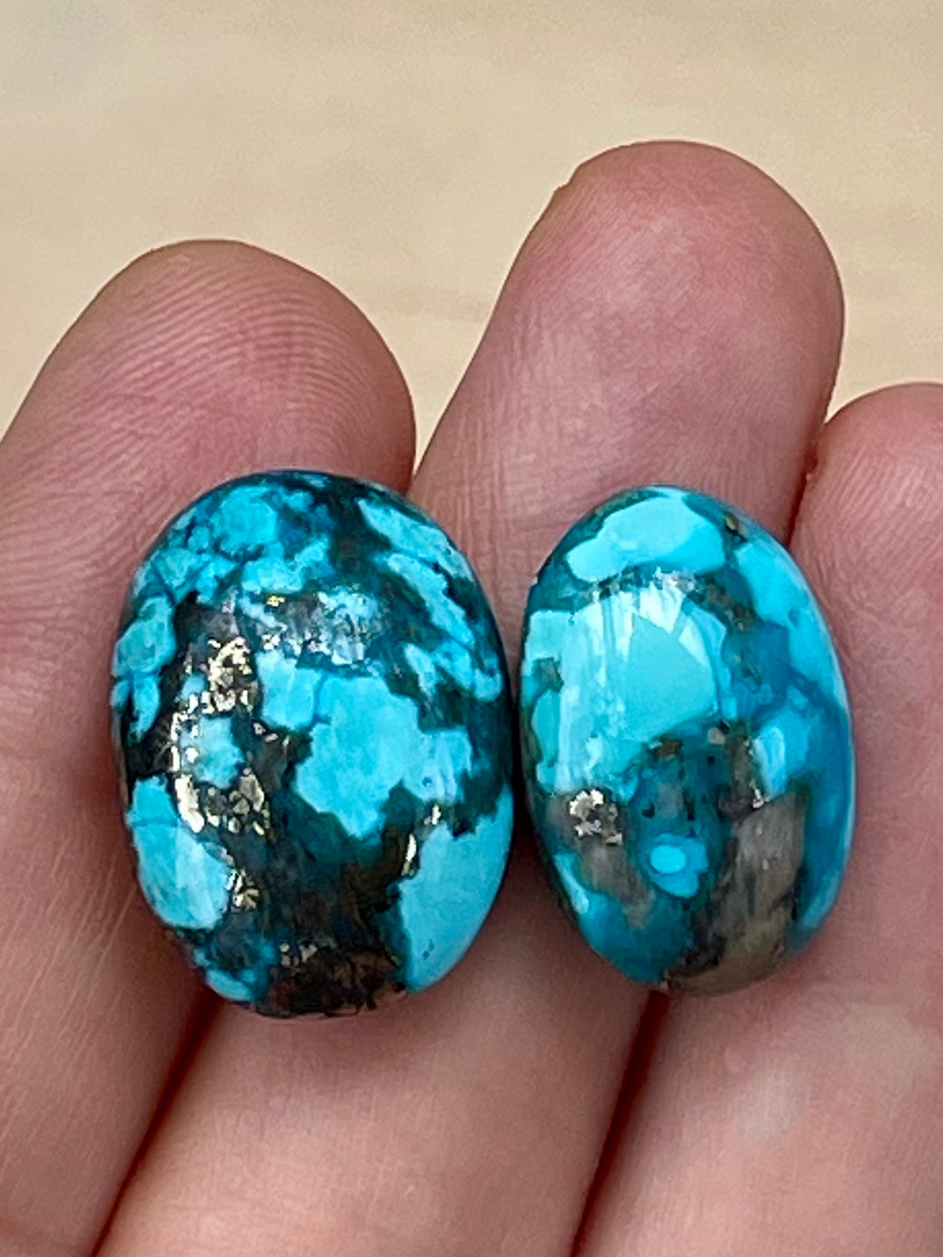 2 absolutely amazing turquoise stones from the Kerman mine in Southern Iran. They have very unique webbing pattern and the colour is beautiful. Furthermore the golden pyrite inclusions make them even more attractive and special. They would make fantastic rings, pendants or even bracelets.