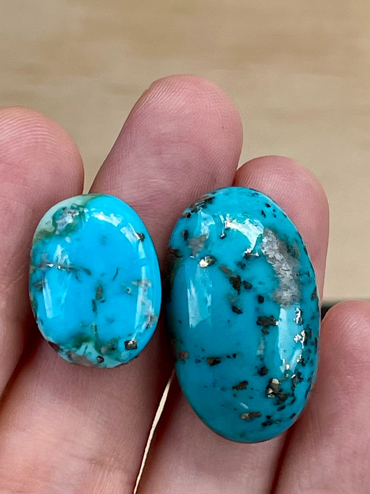 Upgrade your jewellery designs with this stunning pair of genuine Iranian turquoise stones, sourced directly from the famous Kerman mine in Southern Iran. Known for producing some of the world’s most desirable turquoise, Kerman material is prized for its rich colour, and its golden pyrite inclusions.