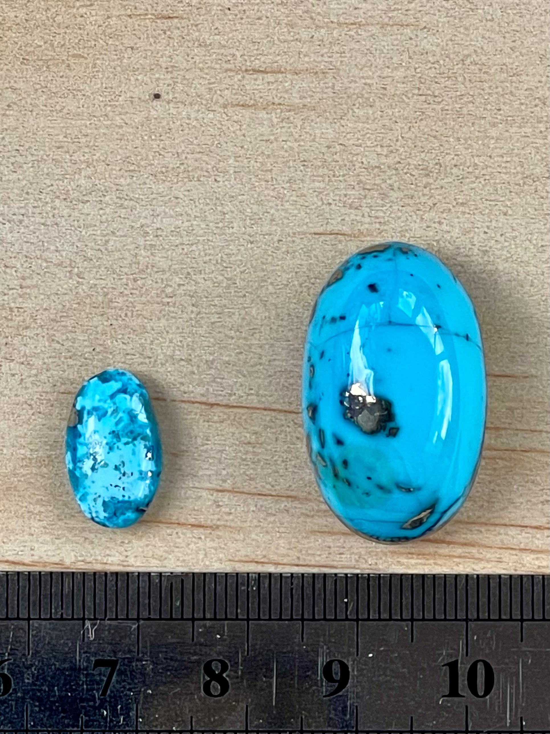 2 gorgeous turquoise cabochon stones from Kerman mine in Southern Iran. They have what I call happy-blue shades, similar to baby-blue with an electric vibe. There are some mirror shine golden pyrite crystal inclusions too. This is a fantastic pack for making an outstanding pendant and a ring that will be a head turner and topic of conversations.