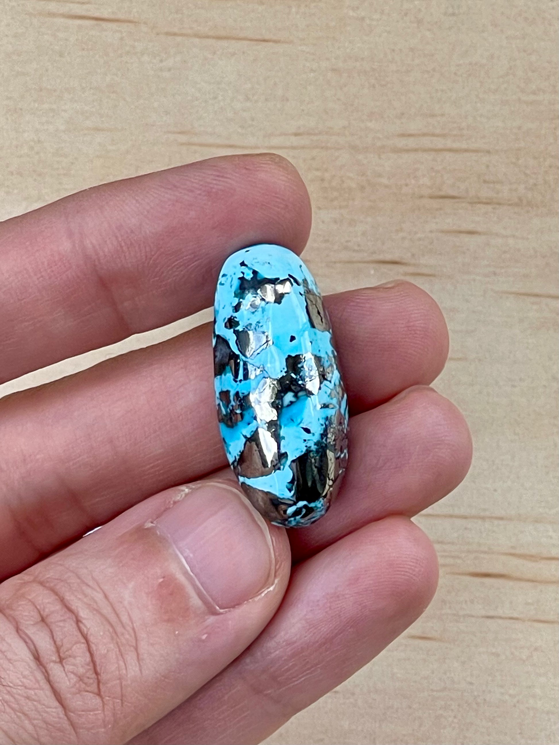 Turquoise Cabochon from Kerman Mine, Iran. With Pyrite Crystals. #K1